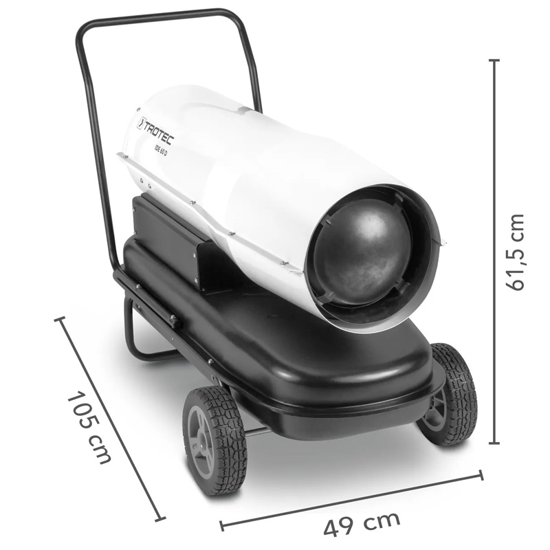 Bineinteles, incalzitorul cu ulei IDE 60 D este, de asemenea, echipat ideal pentru aplicatii de incalzire in aer liber – montat pe un carucior cu rulare lina, cu suporturi pentru cabluri si rezervor de combustibil integrat precum si carcasa rezistenta din material dublu vopsit fac ca incalzitorul cu motorina sa fie la fel de mobil pe cat este de rezistent la intemperii.